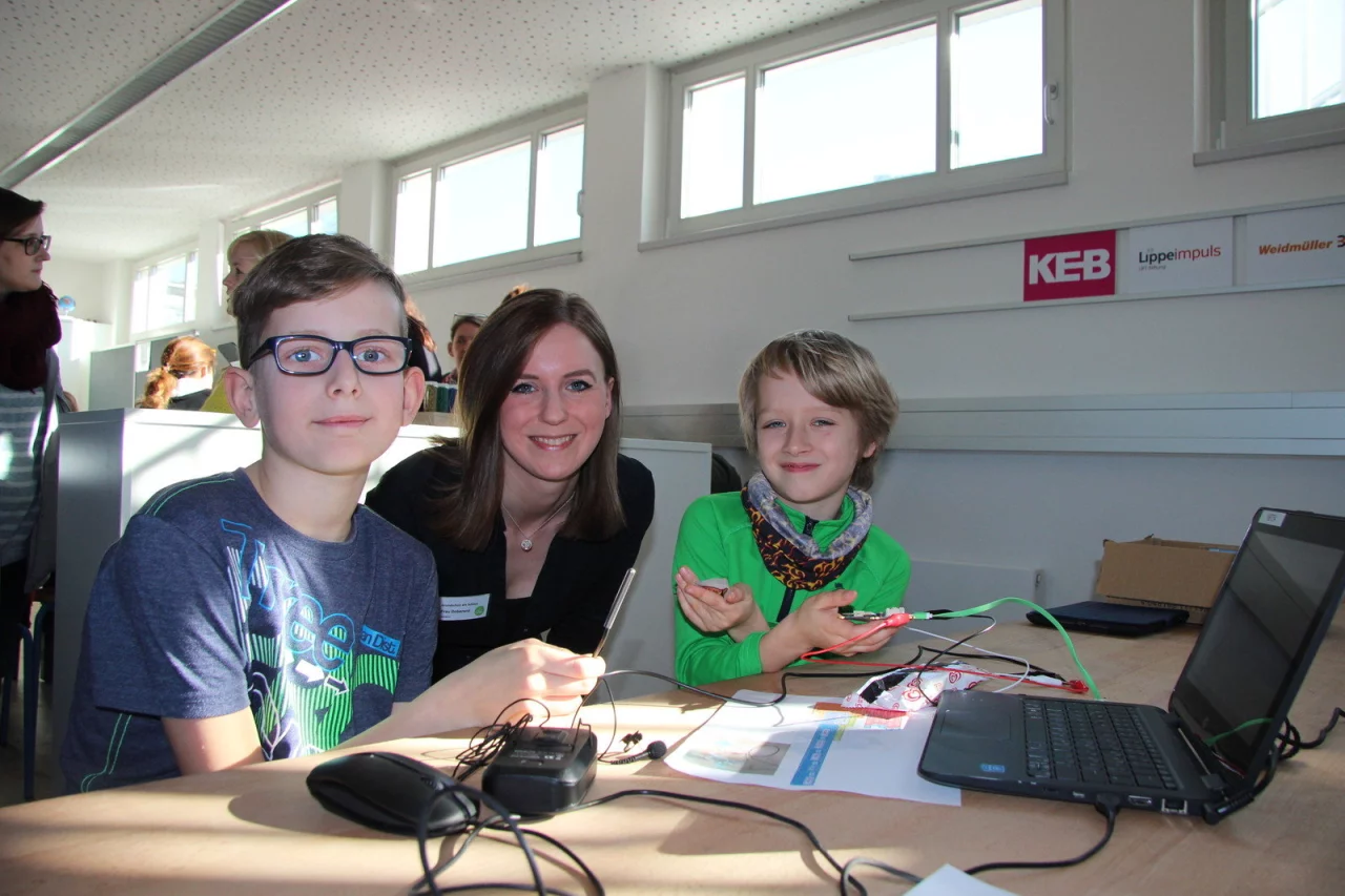 Gemeinsam mit Lehrerin Carmen Doberenz haben sie sich in der Medien-AG mit dem Thema Programmieren beschäftigt. Das wurde ihnen dank "Calliope" leicht zugänglich gemacht, denn mit USB-Kabel und Internet-Anschluss kann es dank gut verständlicher Software, diverser Bauteile und Anleitungen direkt losgehen. „Die Kinder haben das Vorgehen fast intuitiv begriffen", erzählt Carmen Doberenz von den Lernerfolgen und auch ihr, als – wie sie lachend gesteht – wenig Technik-affiner Lehrerin wurde der Einstieg damit sehr einfach gemacht. Vor den Kollegen aus den anderen Grundschulen zeigten ihre Schüler im zdi-Zentrum an der Johannes-Schuchen-Straße, mit welchem Spaß sie in den vergangenen Wochen in die ihnen bis dato unbekannte Welt des Programmierens eingetaucht sind und ließen etwa Klaviertöne erklingen oder eine Ampel leuchten.