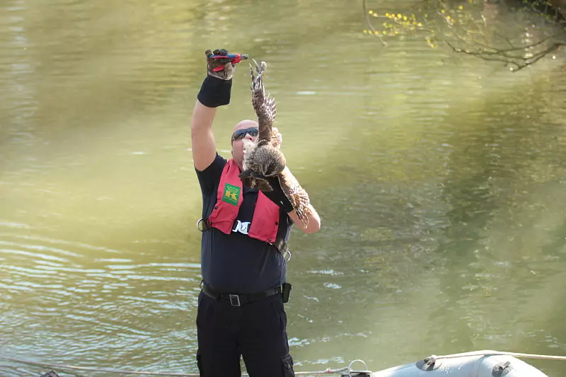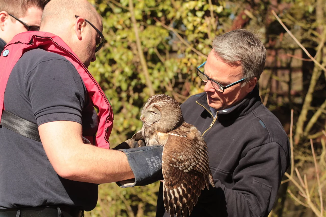 Wie lang die Eule dort zu diesem Zeitpunkt schon in Seitenlage hing, vermochten die Einsatzkräfte der Feuerwehr nicht zu deuten. Frank Hoppe, in Tierrettungen inzwischen äußerst erfahrener Mann der Truppe, stieg ins Schlauchboot und paddelte zur Flussmitte... mit der Linken Griff an die gefährlichen Krallen, mit der Rechten schnitt er das Tier los. Trotz der ungewohnten Nähe zum Menschen leistete der Greifvogel kaum Gegenwehr, hatte ihn der offensichtlich schon länger dauernde Befreiungskampf über der Bega einiges an Kraft gekostet. Feuerwehrmann Andreas Schröder brachte das Tier in einer Gitterkiste zur Adlerwarte nach Berlebeck. Dort soll die Eule nach Worten von Schröder aufgepäppelt werden. „Sie ist ein bisschen platt vom Abhängen, aber ansonsten gesund", brachte der „Eulenkurier" gute Nachrichten mit. „Später lassen sie das Tier dann einfach fliegen."