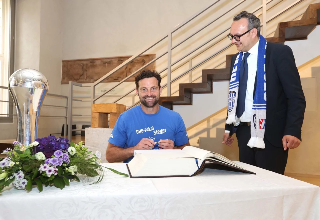 Lemgo. Noch einige Tage eilen die Pokalsieger des TBV Lemgo Lippe von Termin zu Termin, bevor eine erfolgreiche Saison ihr Ende findet. Nun folgten Spieler, Trainerteam, Betreuer, Geschäftsführung und Beirat der Einladung in das Lemgoer Rathaus, um sich im Goldenen Buch der Alten Hansestadt zu verewigen.