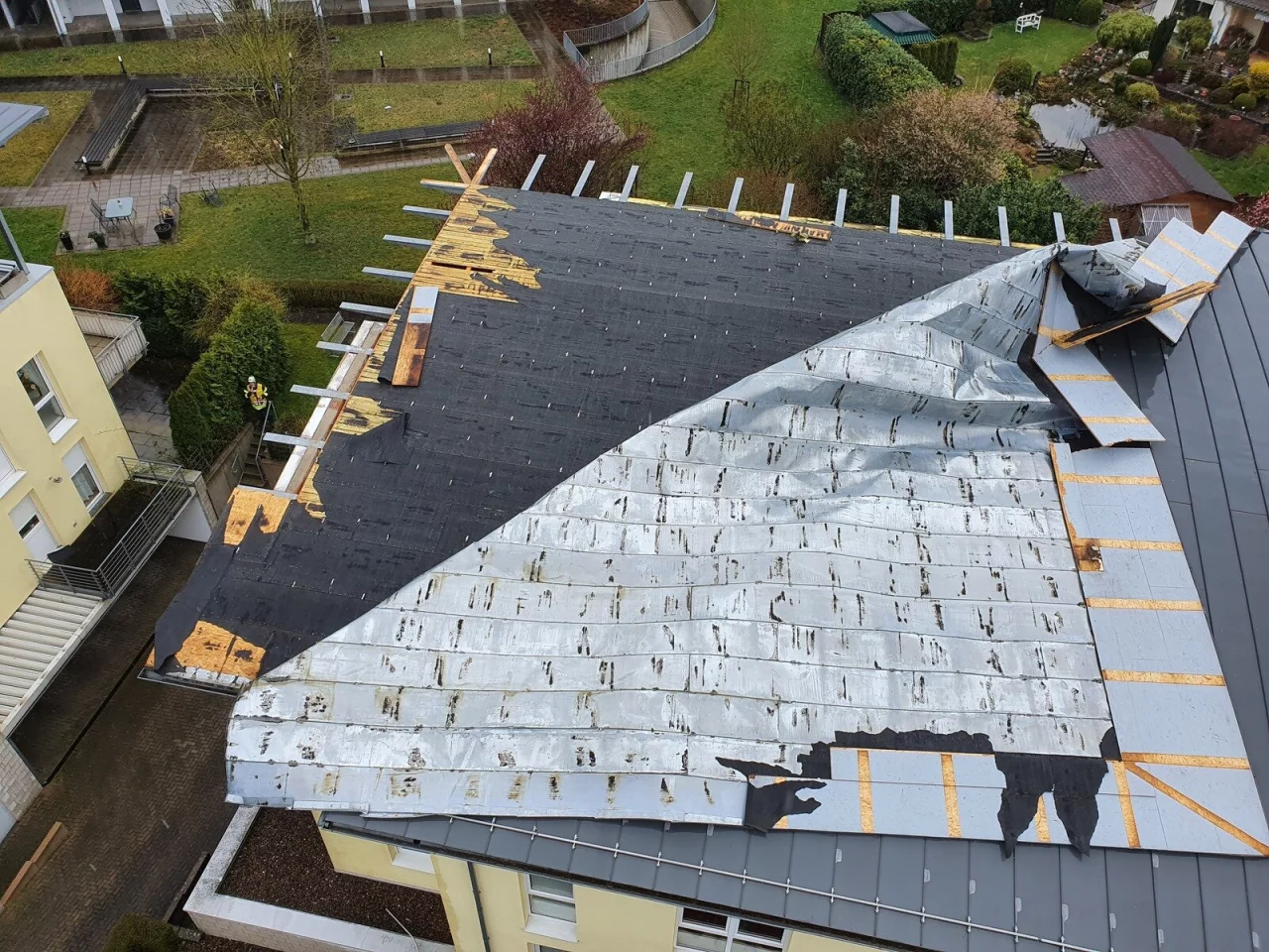 Die Einsatzkräfte der Drehleiter und eines Löschfahrzeuges sicherten die Einsatzstelle, nahmen lose Teile der Dacheindeckung ab und transportierten diese nach unten. Ein bereits durch den Hauseigentümer bestellter Dachdecker übernahm anschließend die weitere Sicherung des Daches.