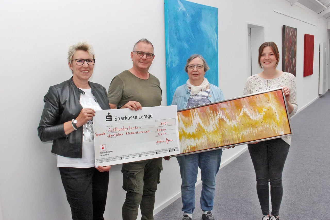 Zum Auftakt der Ausstellung wurde eines seiner Bilder zu Gunsten des Kinderschutzbundes, Ortsverband Lemgo, verlost, heißt es in einer Mitteilung an die Medien. Der Verkauf der Lose brachte 810 Euro für den Kinderschutzbund ein. Das Los mit der Nummer 131 gewann das Bild, das der Künstler jetzt mit dem Titel ”EKG” belegte. Gewinnerin ist dem Bericht zufolge Ursula Herr aus der Buchhandlung Pegasus. Das Bild wurde jetzt im Hanse-Haus übergeben, soll aber nach dem Willen der neuen Besitzerin noch bis zum Ende der Ausstellung, am 31. August, dort hängen bleiben.