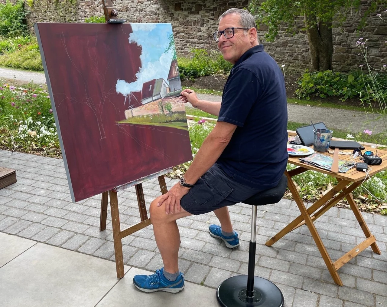 Sein Motiv war die Gartenlandschaft der Landesgartenschau auf der Wallanlage Höxter. Trotz des wechselhaften Wetters seien viele Besucher in den Gärten unterwegs gewesen. „Ich liebe es, in der Natur zu malen und freue mich über Besucher, die mir Fragen stellen und mein Gemälde kommentieren oder einfach nur Freude daran haben, mir beim Malen zuzuschauen“, beschreibt Siekmann den Tag in Höxter.