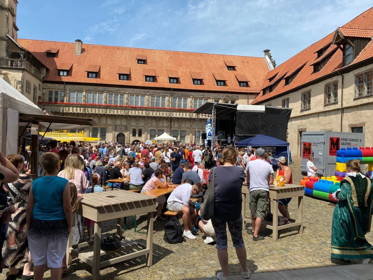 Darüber hinaus bietet das Weserrenaissance-Museum im Halbstunden-Takt Kurzführungen durch die Dauerausstellung an und wer mag, kann sich in nachgeschneiderte Renaissance-Kostüme hüllen. Passend dazu lädt der Verein Alt Lemgo an dem Tag dazu ein, die Ölmühle zu besichtigen. Und natürlich gibt es auch zahlreiche Stände mit herzhaften und süßen Leckereien.