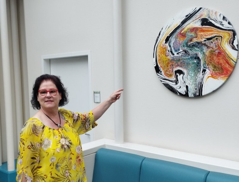 Die Bilder seien mit Acryl-Pouring entstanden. 2023 habe sie angefangen, runde Leinwände zu nutzen. Sie nutze unter anderem Pinsel, Kamm Luftballon, Gabel oder auch den Fön. Farben machten die Welt bunt. „Ich freue mich immer, wenn sich Menschen von meinen Bildern begeistern lassen und sehr viel hinein interpretieren. Und jede Sekunde, die sie länger vor einem Bild stehen bleiben, macht mich glücklich.“