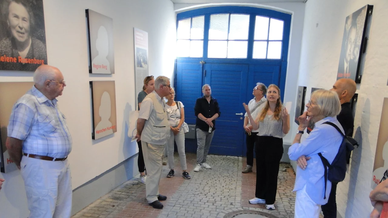 Sara Elkmann, Mitarbeiterin der Gedenkstätte in der Echternstraße 70, führte rund 30 Besucher in die neue Ausstellung ein. Die Fotogalerie ergänzt die „Stolpersteine“ vor der Haustür auf anschauliche und eindringliche Weise. Die Bilder sind nämlich mit kompakten Darstellungen der jeweiligen Lebensgeschichten auf Tafeln kombiniert, die der Betrachter am Bildrand herausziehen kann.