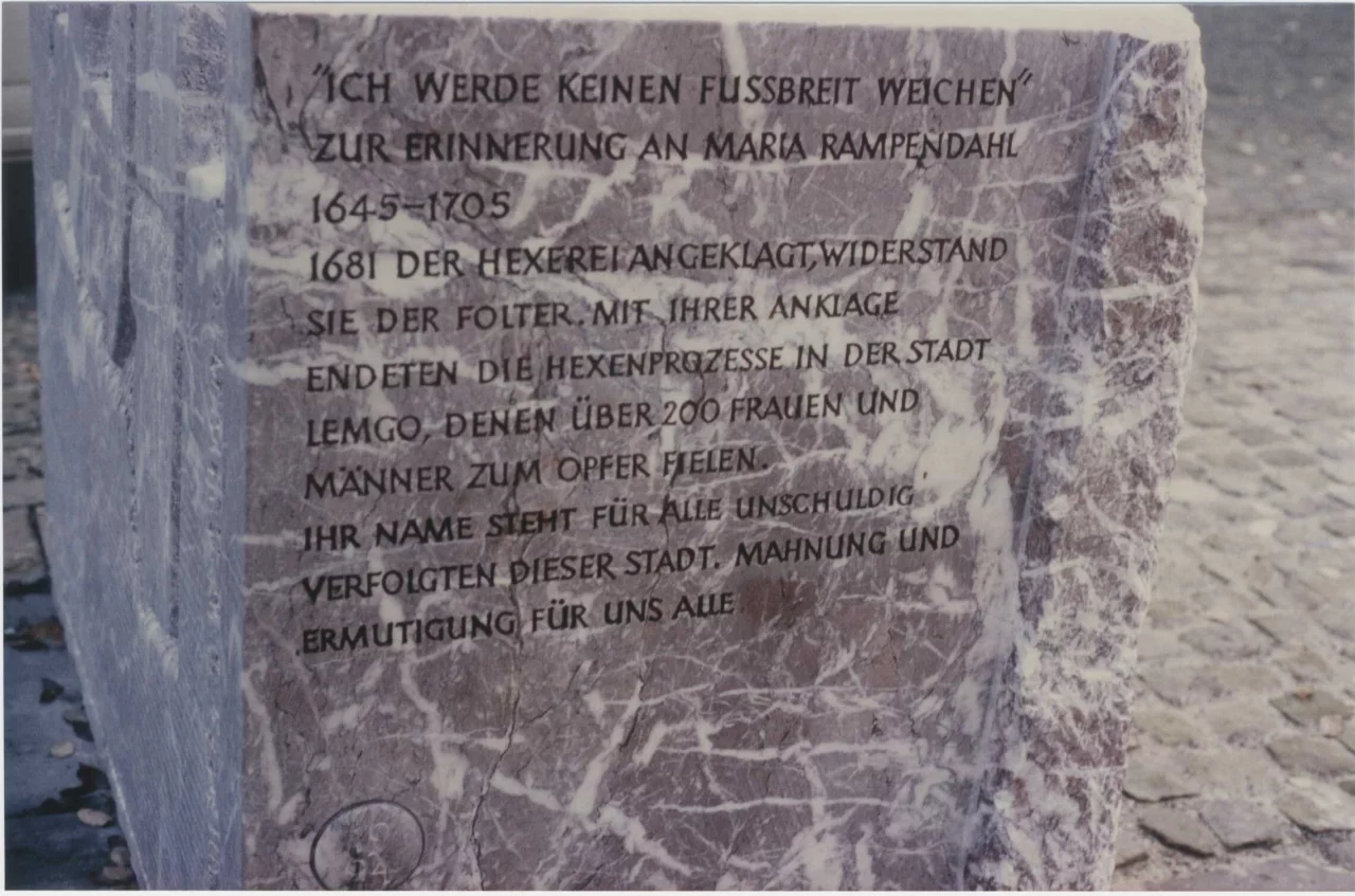 In Erinnerung an die Opfer der Lemgoer Hexenverfolgung entwarf die Lemgoer Künstlerin Ursula Ertz vor 30 Jahren den zwischen dem Lemgoer Rathaus und der Nicolaikirche platzierten „Stein des Anstoßes“. Der Stein wurde vom Arbeitskreis Maria Rampendahl initiiert, um den verfolgten Frauen und Männern am Beispiel von Maria Rampendahl ein Denkmal zu setzen. Maria Rampendahl (1645-1701) war die letzte in Lemgo wegen Hexerei angeklagte Person.