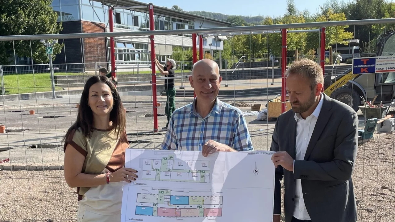 Mit der Überarbeitung der Außenanlagen soll vor allem die Aufenthaltsqualität auf dem oberen Schulhof verbessert werden, heißt es weiter. Zudem werde die Tartanbahn beim Sportplatz saniert. „Wir reduzieren die Bodenversiegelung und verbessern durch Neuanpflanzungen das Mikroklima auf dem Schulgelände“, erläutert Thomas Rieß, projektleitender Architekt beider Maßnahmen beim Kreis Lippe. Laut Rieß sollen die Arbeiten am Schulhof bereits zum Jahresende abgeschlossen sein.