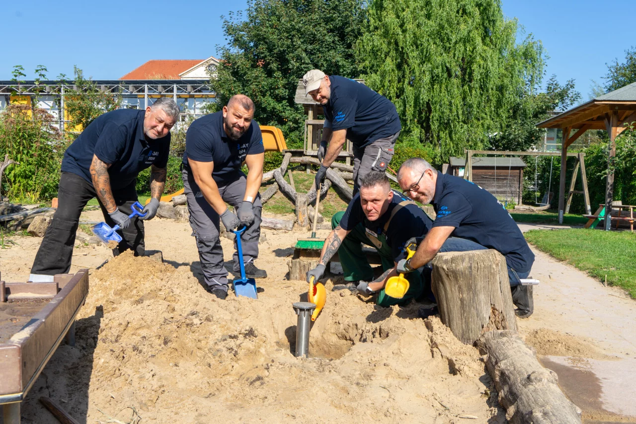 „Wir freuen uns sehr, dass unser Mitarbeiter Mark Bergmann den Kontakt zu Ihnen hergestellt hat und wir diesen sozialen Tag von Ihnen geschenkt bekommen haben“, begrüßte Geschäftsführer Falko Heise die etwa 50 Mitarbeiterinnen und Mitarbeiter aus Wesel und den benachbarten Niederlanden bei strahlendem Sonnenschein um neun Uhr morgens auf dem Kirchplatz in Neu-Eben-Ezer. „Sie helfen uns bei der Umsetzung von Projekten, die wir im Alltag nur schwer hätten umsetzen können, zum Beispiel mit der Anlage eines Barfußpfades. Dafür sage ich ein ganz großes Dankeschön.“