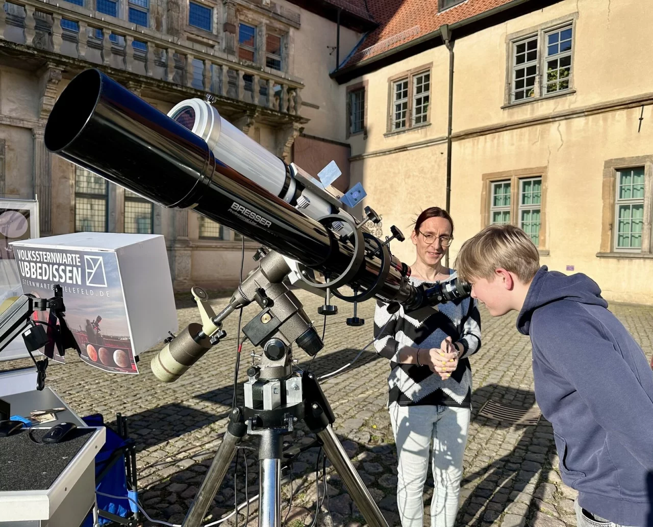Lemgo. Ein Auge zukneifen, mit dem anderen durchs Teleskop gucken und einen gefahrlosen Blick auf die Sonne werfen. Das war am Sonntag auf dem Hof des Weserrenaissance-Museum Schloss Brake möglich. Passend zur aktuellen Sonderausstellung „Alles außer irdisch. Sternstunden der Astronomie“ hatte das Museum in Kooperation mit der Volkssternwarte Ubbedissen zu diesem astronomischen Abenteuer eingeladen. Laut Pressemitteilung des Landesverbandes Lippe sind zahlreiche Besucher bei idealem Wetter gekommen.
