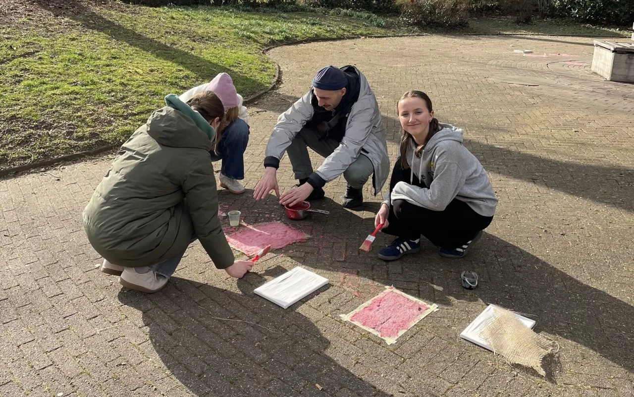 Im Kunstworkshop erprobten 20 Schülerinnen und Schüler des Marianne-Weber-Gymnasiums (MWG) die Technik des Düsseldorfer Künstlers Nils Levin Sehnert, aktueller Stipendiat „Junge Kunst“. Im Verfahren „History Paintings“ formt Sehnert Bodenflächen ab, die Momentaufnahmen des Verhältnisses zwischen Mensch und Umwelt sind. „Eine Abformung ist für mich eine Art plastisches Foto“, erklärte der Künstler den Schülern seine Arbeitstechnik.