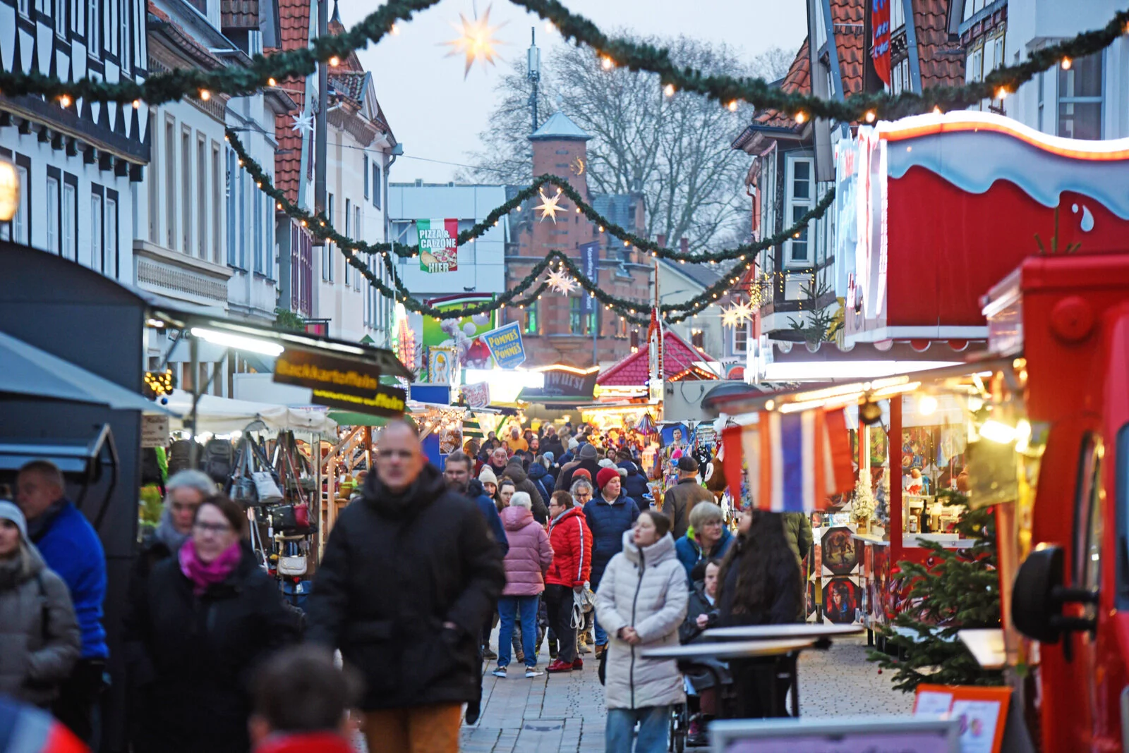 Lemgo. Bei idealem Glühweinwetter ist am Donnerstag Kläschen gestartet – trocken und kalt. Vom Regenstorplatz bis zum Lippegarten erwartet die Besucher bis einschließlich Sonntag eine bunte Mischung aus Weihnachtsmarkt und Rummel. Genau diese Auswahl schätzen die Gäste, die gern jedes Jahr wiederkommen, denn Kläschen ist gerade bei den Lippern stets ein fester Termin im Jahreskalender. Und auch wenn die inzwischen stark gestiegenen Preise nicht mehr den Konsum erlauben, der vor ein paar Jahren noch möglich gewesen ist, möchten die Menschen auf einen Rundgang dennoch nicht verzichten - denn der kostet schließlich nichts. Besonders schätzen die Besucher die Atmosphäre des Marktes, die durch die Lage im Herzen der weihnachtlich dekorierten Stadt besticht.