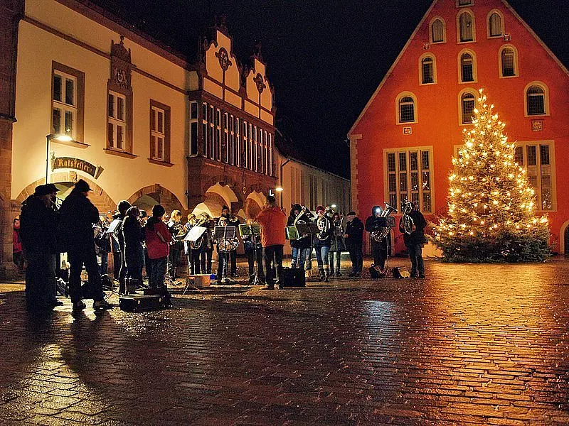 Lemgo. Trotz des schlechten Wetters fanden am Samstagabend immer mehr Zuhörer den Weg auf den Marktplatz. Nach erledigten Weihnachtseinkäufen freuten sich viele über eine kleine Pause – und so standen nach kurzer Zeit rund 70 Besucher unter den schützenden Vordächern. Zu hören war stimmungsvolle Musik zum Advent, gespielt vom Lemgoer Posaunenchor unter der Leitung von Uwe Müller.