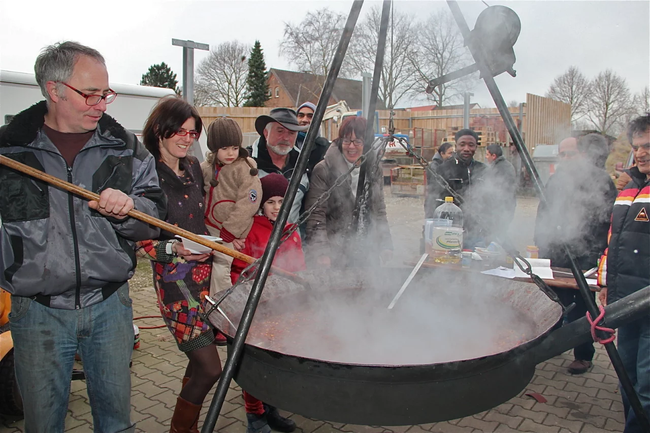 Bei der Vorbereitung konnten die Familien Wegener und Krein auf zahlreiche fleißige Helfer der Kirchengemeinde zählen. Auch die Asylbewerber packten kräftig mit an. "Die Idee ist, dass sich niemand einfach an den gemachten Tisch setzt, sondern aktiv mitarbeitet," betonte Erhard Wegener, während er die verschiedenen Aufgaben verteilte. Gemeinschaftlich wurden Berge von Gemüse geschnippelt, Tische dekoriert und an der Feuerstelle wurde ordentlich eingeheizt. Kinder unterschiedlicher Herkunft spielten auf dem großen Hof und unterhielten sich mit Händen und Füßen. "Bei ihnen sind die Berührungsängste deutlich geringer als bei uns Erwachsenen", unterstrich Wegener mit Blick auf die zahlreichen Nationalitäten, die hier zusammentrafen.