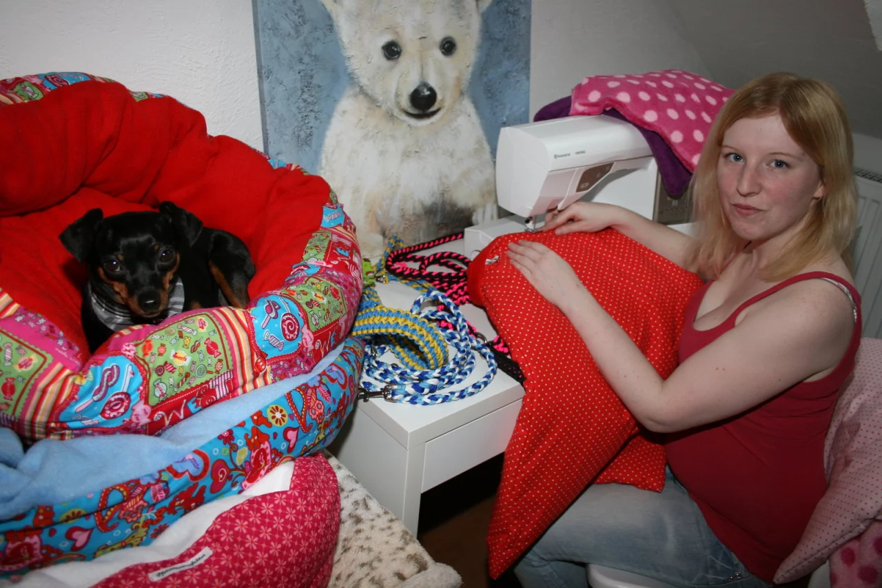 Die 28-Jährige weiß, was die tierischen Familienmitglieder wollen, denn neben sechs anspruchsvollen Katzen lebt auch „Rambo“ in ihrem Haushalt. „Mein Model“, stellt die junge Frau den quirligen Zwergpinscher vor. Und tatsächlich ist er die beste Werbung für ihre handgefertigten Produkte. Stolz posiert er mit seinem maßangefertigten Halsband, springt von einem Körbchen in das nächste und kuschelt sich gemütlich in den weichen Fleece-Stoff. Könnte ein Getreide-Leckerchen der Sorte Leberwurst oder Käse abfallen, tut er auch gerne so, als sei er eine Katze.