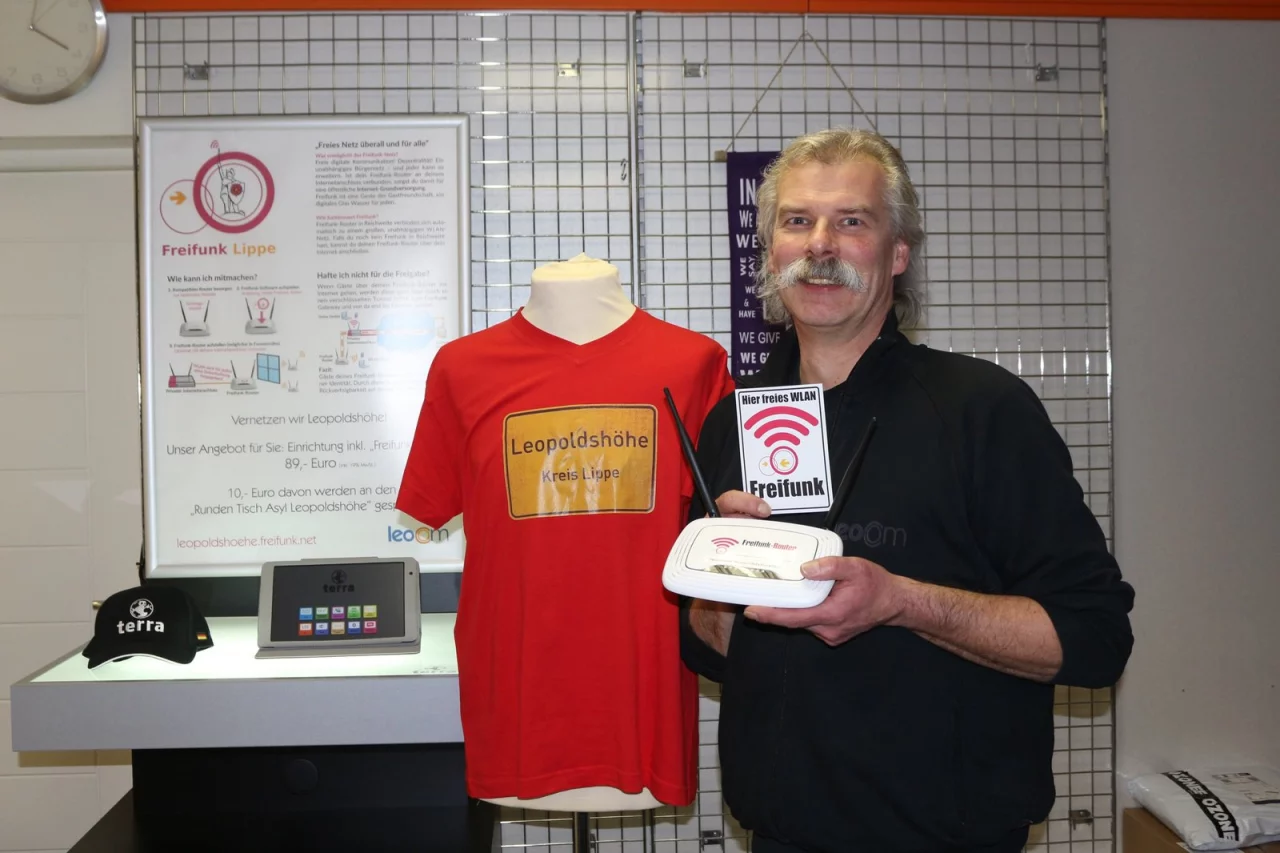 „Wir konnten einige Leopoldshöher Geschäfte für die Freifunk-Idee begeistern", freut sich Dirk Czychun. Im Leopoldshöher Ortskern machen InSign, Physiotherapie Braun, die Medienwerkstatt Vogel, das Café im Eck, die Leopolds-Apotheke und auch die Seniorenresidenz Sielemanns Hof mit. Einen Freifunk-Router könne sich jeder Mensch mit ein wenig technischer Versiertheit und unter Lektüre einer Anleitung, die im Internet zu finden ist, einrichten, sagt der Freifunk-Fan.