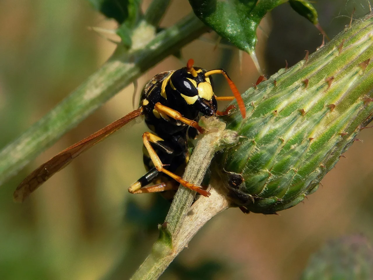 Dabei ist Dudler auf die Französische Feldwespe gestoßen. Sie unterscheidet sich rein äußerlich stark von der Gemeinen Wespe, die üblicherweise hier in der Region unterwegs ist. Diese Französischen Feldwespen mögen es trocken und warm. „Sie treten seit ein paar Jahren vermehrt bei uns auf", hat Dudler beobachtet. Für Dudler ist das ein Zeichen, dass sich das Klima dauerhaft wandelt. Aber auch für diese Wespen scheint es zu trocken zu sein. Die Wespe hat mit ihren Zangen ein Blütenköpfchen abgezwickt. Aus dem Stengel quillt Flüssigkeit. „Sie muss so durstig gewesen sein, dass sie sich von mir nicht hat stören lassen", berichtet Dudler.