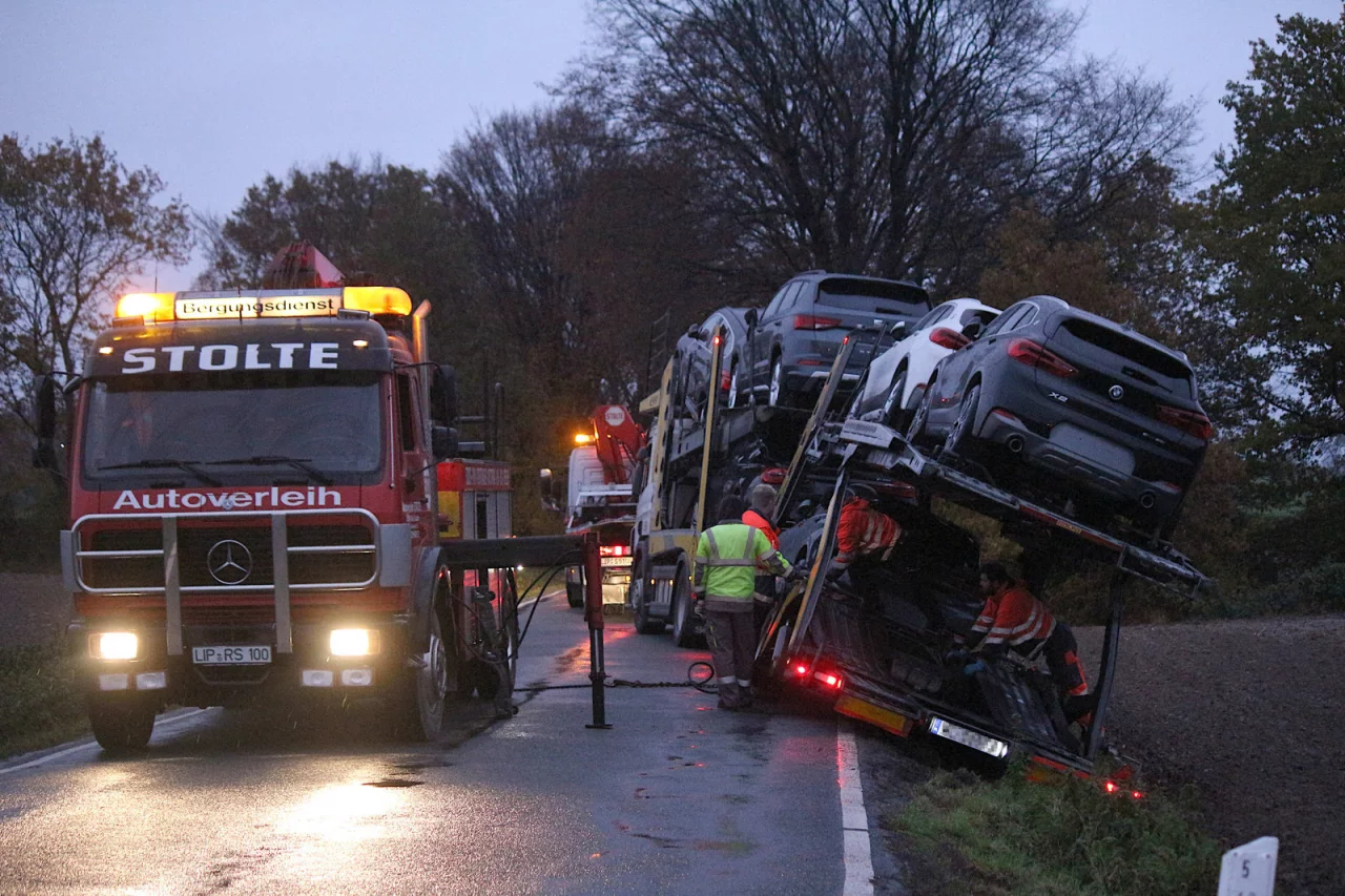 Der Verkehr musste anschließend an den Abfahrten Gut Eckendorf und Weststraße abgeleitet werden. Der mit sechs Fahrzeugen beladene Lastwagen musste nach Angaben der Polizei mit schwerem Gerät geborgen werden. Nach Auskunft von Anwohnern handelt es sich offenbar um den vierten Unfall an dieser Stelle innerhalb eines Jahres.