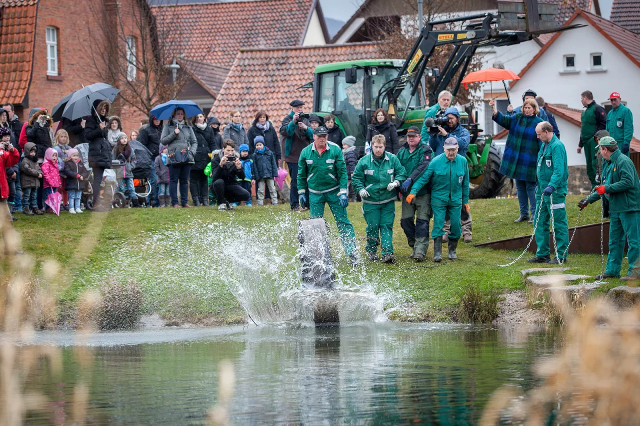 Dazu waren die Vereinsmitglieder Montagnachmittag am Ufer der Emmer zusammen gekommen, wo die Räder unter dem Beifall von gut 100 Schaulustigen zu Wasser gelassen wurden. An einer Kette gesichert werden die Räder hier die kommenden Tage verbringen, „um sich ordentlich mit Wasser vollzusaugen", erklärte der Sprecher des Dechenvereins, Dieter Stumpe. Zum Osterräderlauf sollen schließlich nicht die Räder brennen, sondern lediglich ihre entflammbare Füllung.