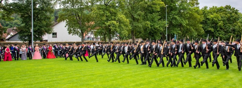 Höhepunkt und Gaudi für Beteiligte und die zahlreichen Zuschauer war wieder der Parademarsch im Stechschritt auf dem Sportplatz.