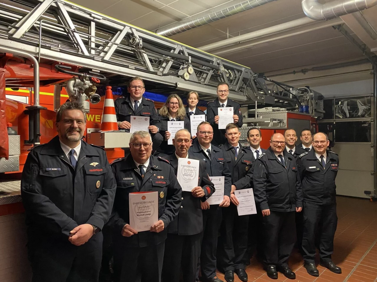 Es seien zwar insgesamt weniger Einsatzstunden geleistet worden, dafür wesentlich mehr sonstige Stunden, schreibt der Löschzug - unter anderem in Lehrgängen und Seminaren. Bürgermeister Torben Blome habe die Arbeit des Löschzuges gewürdigt: Im Hochwassereinsatz zu Weihnachten, beim Großbrand bei SH Wire und dem Hausbrand an der Oelwiese. Blome habe die Dankbarkeit der Eigentumsfamilie mit den Worten des Hausherren weitergegeben: “Ich war immer stolz, Nachbar der Feuerwehr zu sein“