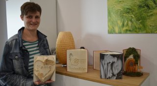 Annette Tintel (links) und Rita Hinkel betrachten die kleinen Häuser. Jedes beeinhaltet ein eigenes Thema.