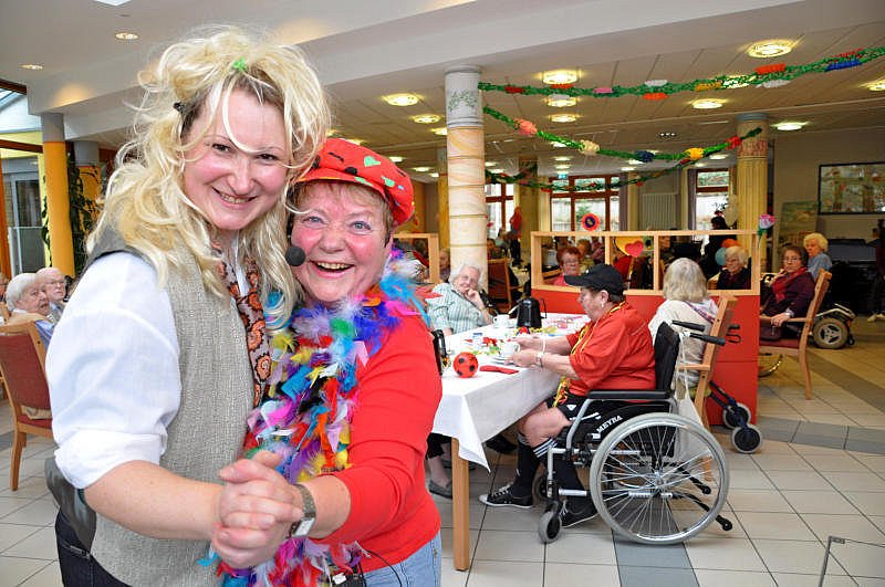 Gleich zwei gern gesehene Gäste lieferten die passenden jecken Rhythmen. Alleinunterhalter Klaus Sieveke stimmte mit seiner Orgel den flotten Donauwalzer an. Dagmar Stock, die mit roter Kappe, Hosenträgern und bunter Federboa eine neue optische Identität angenommen hatte, sang gemeinsam mit den Besuchern das berühmte "Humbatäterä" des unvergessenen Ernst Neger oder forderte zum Gitarrenspiel auf: "Jetzt trink ma noch a Flascherl Wein." "Rucki Zucki" zog die musikalische Karnevals-Karavane weiter, und die Senioren folgten ihr gerne. Viele stimmten mit ein oder hakten sich beim Schunkel-Walzer unter.
