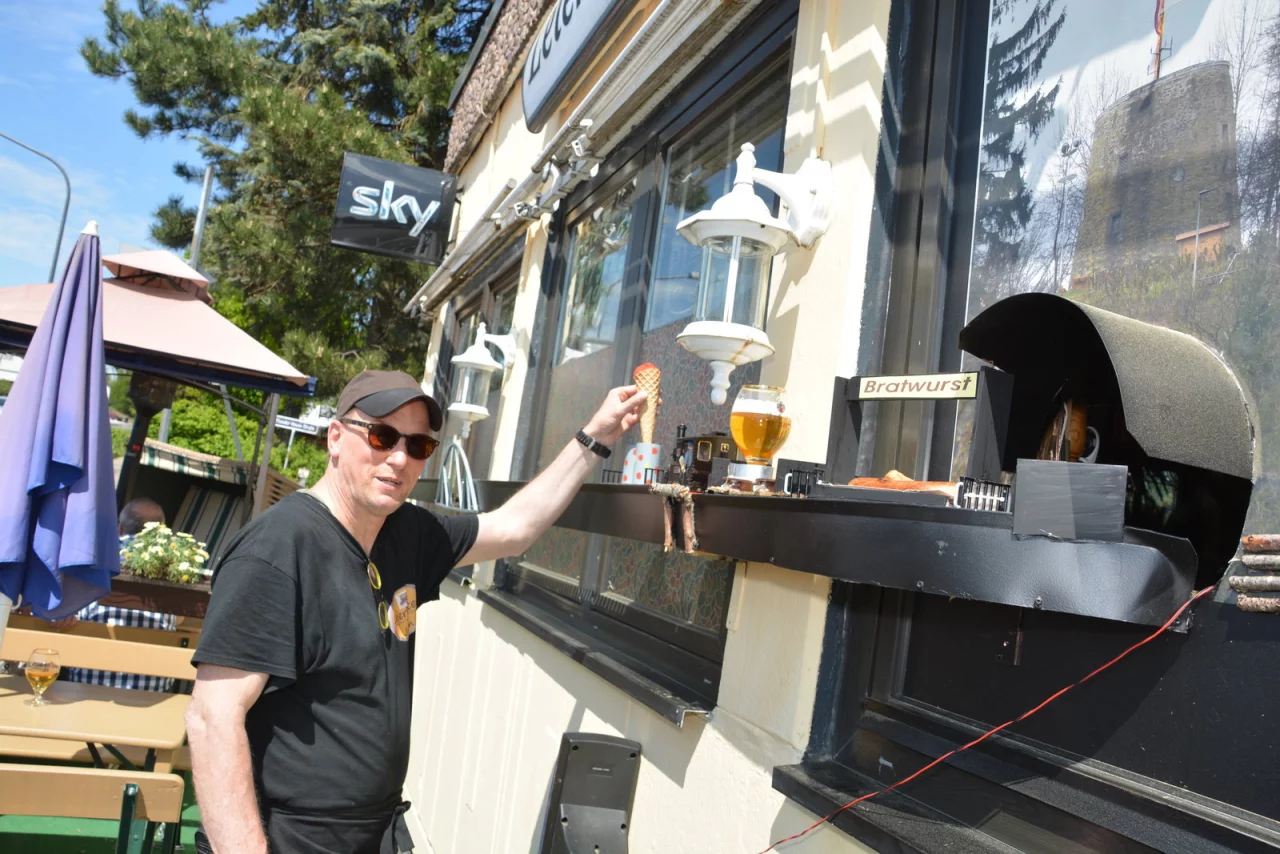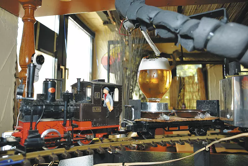 Oerlinghausen. Manfred Opitz und Heinrich Müller sitzen unterm Sonnenschirm vor dem „Leierkasten" in der Südstadt. Zwei kühle Bierchen, die wären jetzt perfekt. Und da kommen sie auch schon. Mit der Eisenbahn. Gibts nicht? Gibts doch. Denn Betreiber Jürgen Voss ist ein echter Tüftler.