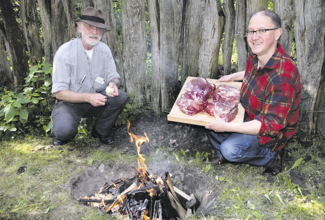 Vor der Kulisse der riedgedeckten Häuser bereiteten die Archäologen ein abendliches Essen wie vor einigen tausend Jahren vor. Statt Rehwild oder Dachsbraten stand zwar gutes Schweinefleisch von der örtlichen Schlachterei auf dem Speiseplan, doch die Zubereitung verlief nach echt archaischer Methode. „Erst wurde eine Grube ausgehoben, ein Feuer darin entfacht und Steine erhitzt. Dann wurde das Fleisch hineingegeben und für einige Zeit unter der Erde gebacken", erklärt Banghard.