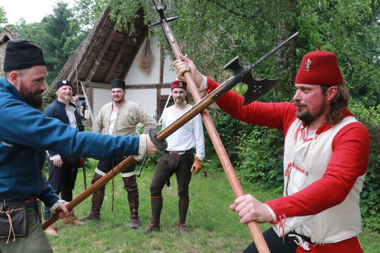 Mit falschen Vorstellungen über das Hochmittelalter räumte die Gruppe „DreyWunder" auf. „Manches, was im Film gut und dramatisch aussieht, ergibt aber im realen Kampf keinen Sinn", erläuterte Henrik Gyarmati. „Wir versuchen, so eng wie möglich an den Quellen zu bleiben, das ist dann häufig eher unspektakulär." Mit Schlachtschwert, Mordaxt und „halben" Stangen stellte die Gruppe dar, wie um 1475 gekämpft wurde.