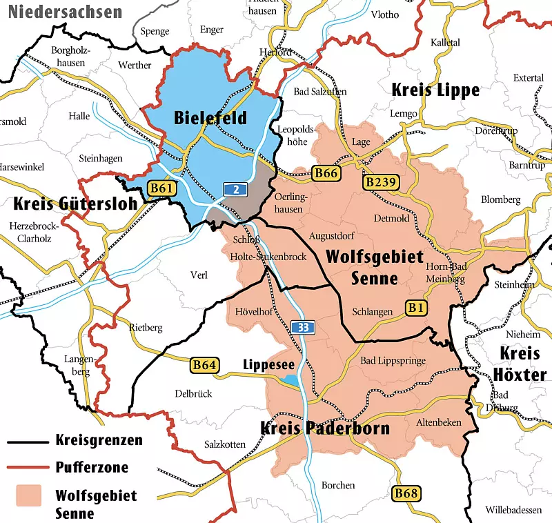 Das eigentliche Wolfsgebiet umfasst 922 Quadratkilometer und berührt die Kommunen Schloß Holte-Stukenbrock, Detmold, Horn-Bad Meinberg, Lage, Oerlinghausen, Augustdorf, Schlangen, Bad Lippspringe, Paderborn, Altenbeken, Hövelhof und Bielefeld.Hinzu kommt eine Pufferzone von 3.390 Quadratkilometern.