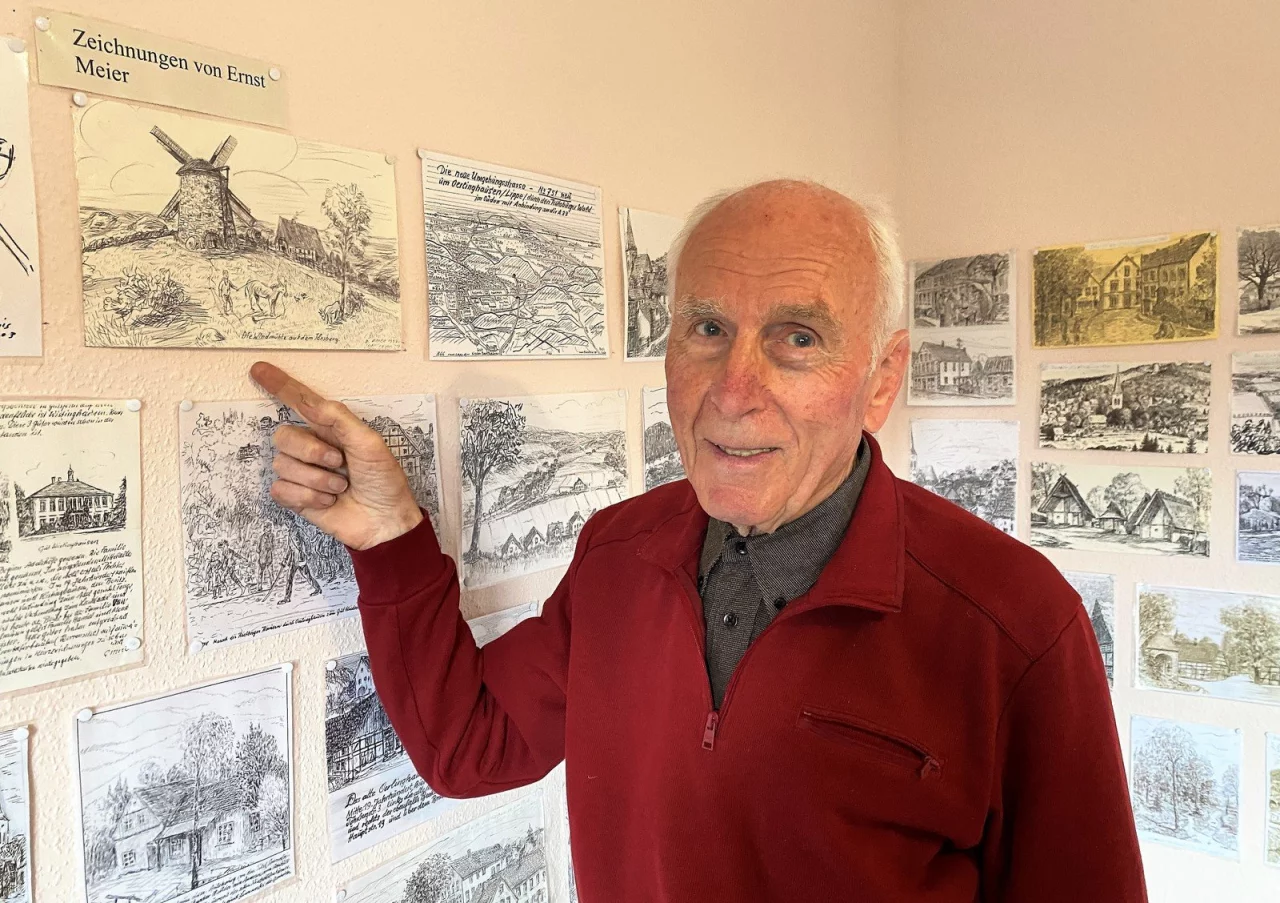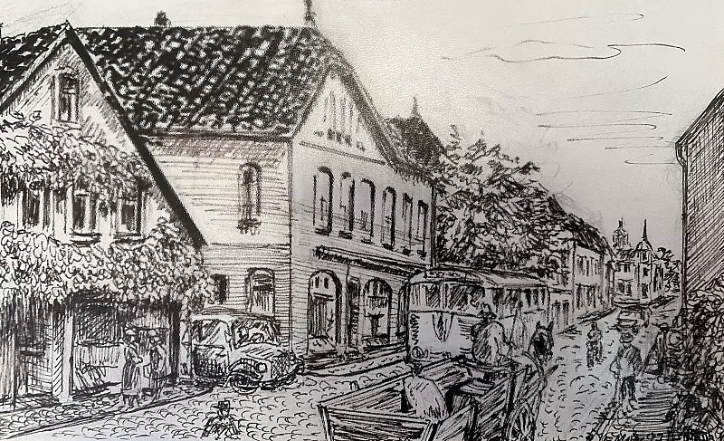 Welche Bilder sind seine Lieblingsmotive? „Die Zeichnungen von meinem früheren Freund Ernst Meier sind echte Schätze“, sagt Werner Höltke. Fast ein ganzer Raum der Ausstellung ist den schwarz-weiß Zeichnungen des alten Oerlinghauser Malers gewidmet. Ernst Meier, der schon vor Jahrzehnten verstorben ist, illustrierte diverse Szenen aus dem dörflichen Leben Oerlinghausens. Er zeigte, wie früher das Wasser für Beckers Brauerei mit dem Esel transportiert wurde oder wie Pferdefuhrwerke gerade am sogenannten „Bremer Eck“ vorbeifahren, dort wo am Anfang der Rathausstraße Bremers Gaststätte lag.