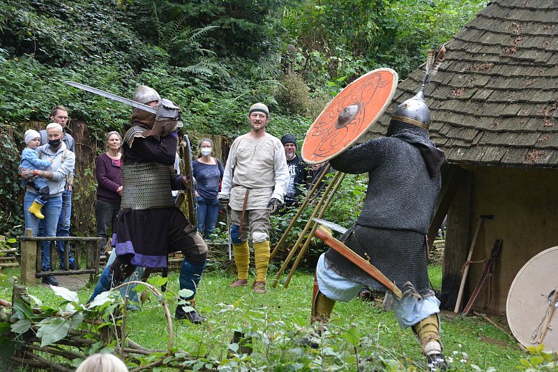 Mehr als 70 Living-History-Darsteller aus Deutschland, den Niederlanden, aus England und Polen nahmen das Publikum bei der 25. Ausgabe der Wikingertage mit in die Zeit von 790 bis 1070 nach Christus. Florian Feitenheimer, Arne Baldauf, Thorsten Brandes und Bernd Burger demonstrierten vor dem Langhaus eindrucksvoll Kämpfe mit Messern, wie sie den einfachen Bauern in der Wikingerzeit zur Verfügung standen, aber auch solche mit der Einaxt, dem Einhand- und dem Zweihandspeer. Dass Schilde nicht nur dem Schutz dienten, sondern ebenfalls als Waffen eingesetzt werden konnten, verwunderte die meisten der Zuschauer.