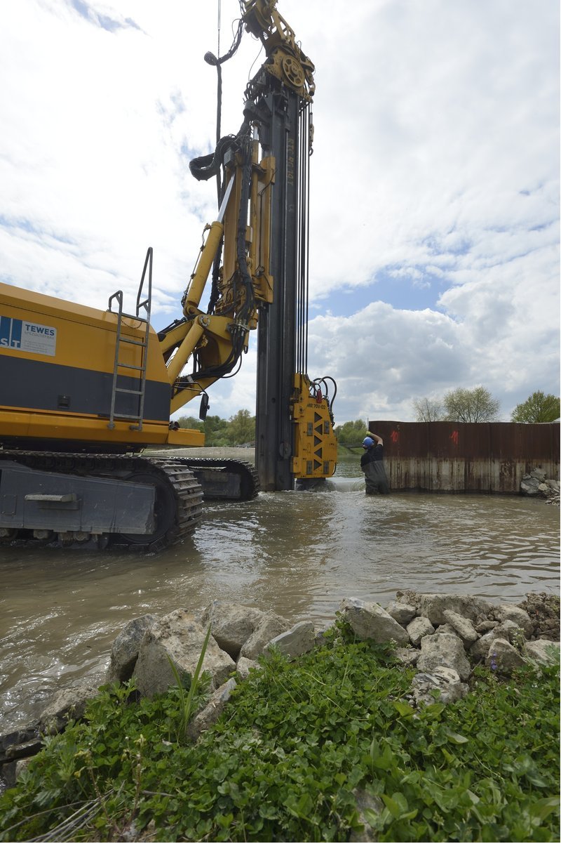 Darum muss zunächst mal die restliche Abtrennung des Sees erfolgen. Derzeit wird ein Damm aufgeschüttet, auf den die Vibrationsramme fahren kann, um von dort die restlichen Spundwände in den Boden zu rütteln. „Wir treiben sie direkt durch diesen Damm.“ Das erspart der Baufirma, noch einmal mit einem Ponton arbeiten zu müssen, das überschüssige Dammmaterial wird am Ende entfernt.