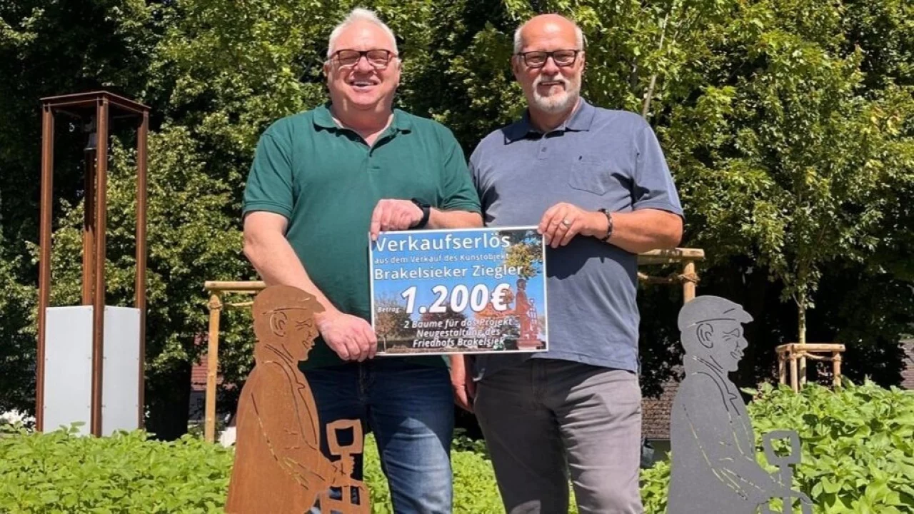 Der Ideengeber hatte von Anfang an klargemacht, dass der Erlös aus dem Verkauf dem Dorf wieder zugutekommen soll. Die Umgestaltung des Friedhofs, die der Heimat- und Verkehrsverein maßgeblich begleitet, war ein willkommener Anlass für Koch, das eingenommene Geld weiterzugeben, er überreichte dem Verein 1200 Euro. Damit wurden auf dem Friedhof zwei Bäume gepflanzt. „Es ist ein schönes Gefühl, vielleicht mal unter den Bäumen begraben zu werden, die man selbst finanziert hat“, sagte Koch bei der Geldübergabe.