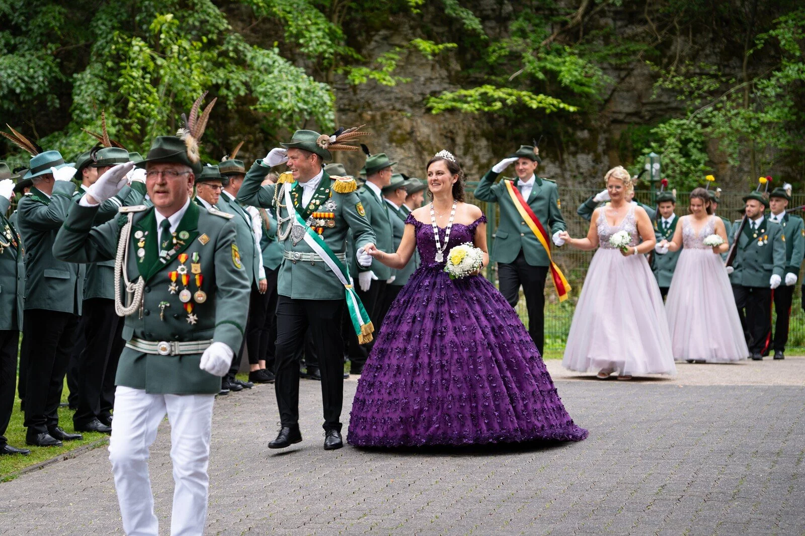 Am zweiten Festtag begeisterte der große Festumzug mit den amtierenden Majestäten Marina und Andreas Reichert samt Hofstaat. Im Anschluss wurde der neue Thron proklamiert. Angeführt von dem neuen Königspaar Nelli und Markus Drinkuth, begleitet von ihrem Hofstaat Carina Mönnikes und Peter Ellies sowie Anja Viola Georgi und Lars Bernet. Bester Jungschütze wurde Sohn des Königs Jan Drinkuth.