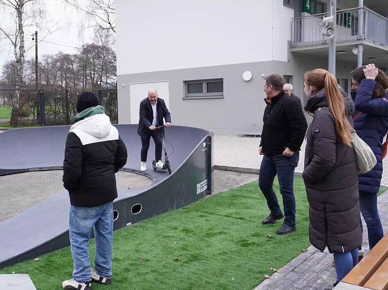 Die besondere Stärke liege in der Vielfalt des Pumptracks, weil er ja mit verschiedenen Fahrzeugen benutzt werden kann. Und auch mit einem Rollstuhl kann man über die Bodenwellen und durch die Steilkurven sausen. „Alle Altersklassen und Leistungslevel können also ihren Spaß auf der neuen Strecke haben“, heißt es. Außerdem sei der Parcours wetterfest und extrem langlebig.