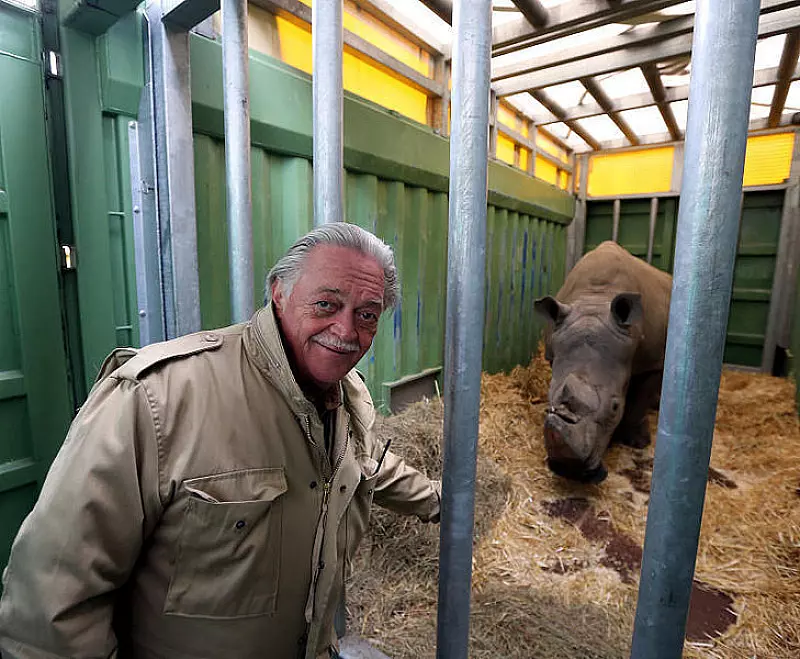 Der betagte Nashornbulle mit den sanften Augen wollte erst nicht in den Spezialcontainer. Er hatte die beiden Jungbullen erschnuppert, die zuletzt damit transportiert worden waren. Das behagte Snoopy gar nicht. Leckereien wie Brötchen, Äpfel und Bananen zogen ihn dann doch Huf für Huf gaaanz langsam in den Container und ebenfalls zögerlich, aber deutlich schneller kommt er im Safaripark wieder heraus. Schnauft zwischendurch unruhig – und das Schnaufen wird zum Entzücken von Parkchef Fritz Wurms und Nashorn-Pfleger Karl-Heinz Lesker erwidert. Buffy ist offenbar nicht abgeneigt. Liebe im Alter soll ja auch unter Nashörnern vorkommen.