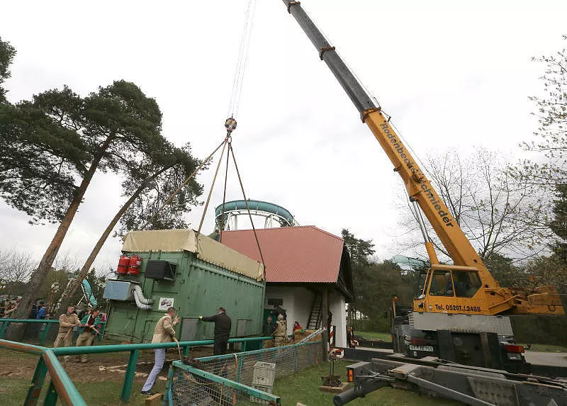 Seine Ankunft im Safaripark war auch für die Besucher spektakulär. Ein 30-Tonnen-Kran der heimischen Firma Rodenbeckenschnieder hievte den Spezialcontainer, der mit Snoopy 7,5 Tonnen wog, vom Fahrzeug und ließ ihn sanft auf das markierte Feld im Gehege, direkt vor dem Stallzugang sanft aufsetzen. Türen auf, Snoopy raus.