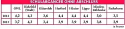 Bielefeld. Die Zahl der Schüler in OWL ohne Hauptschulabschluss steigt weiter; kräftiger sogar als im Landesschnitt Am schlechtesten waren die Zahlen 2013 in Salzkotten (Kreis Paderborn) mit 13,4 Prozent, in Verl (Kreis Gütersloh) verließen dagegen nur 0,2 Prozent der Schüler die Schule ohne Abschluss. Im Regierungsbezirk Detmold hatten voriges Jahr 1.226 Schulabgänger keinerlei Abschluss – 7,2 Prozent mehr als im Jahr zuvor. Das geht aus Zahlen des statistischen Landesamts it.nrw hervor.