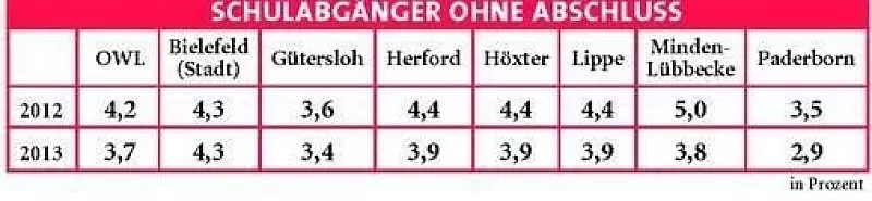 Dass die Zahlen prozentual gleichwohl eine leichte Besserung nahelegen (siehe Tabelle), liegt einzig am doppelten Abiturjahrgang 2013, der die Zahl der Schulabgänger insgesamt nach oben katapultiert hat. In dieser größeren Zahl fallen die Abgänger ohne Abschluss nicht mehr so stark auf. Rechnet man diesem Faktor heraus, stieg die Quote in OWL von 4,21 Prozent (2012) auf 4,52 Prozent (2013).
