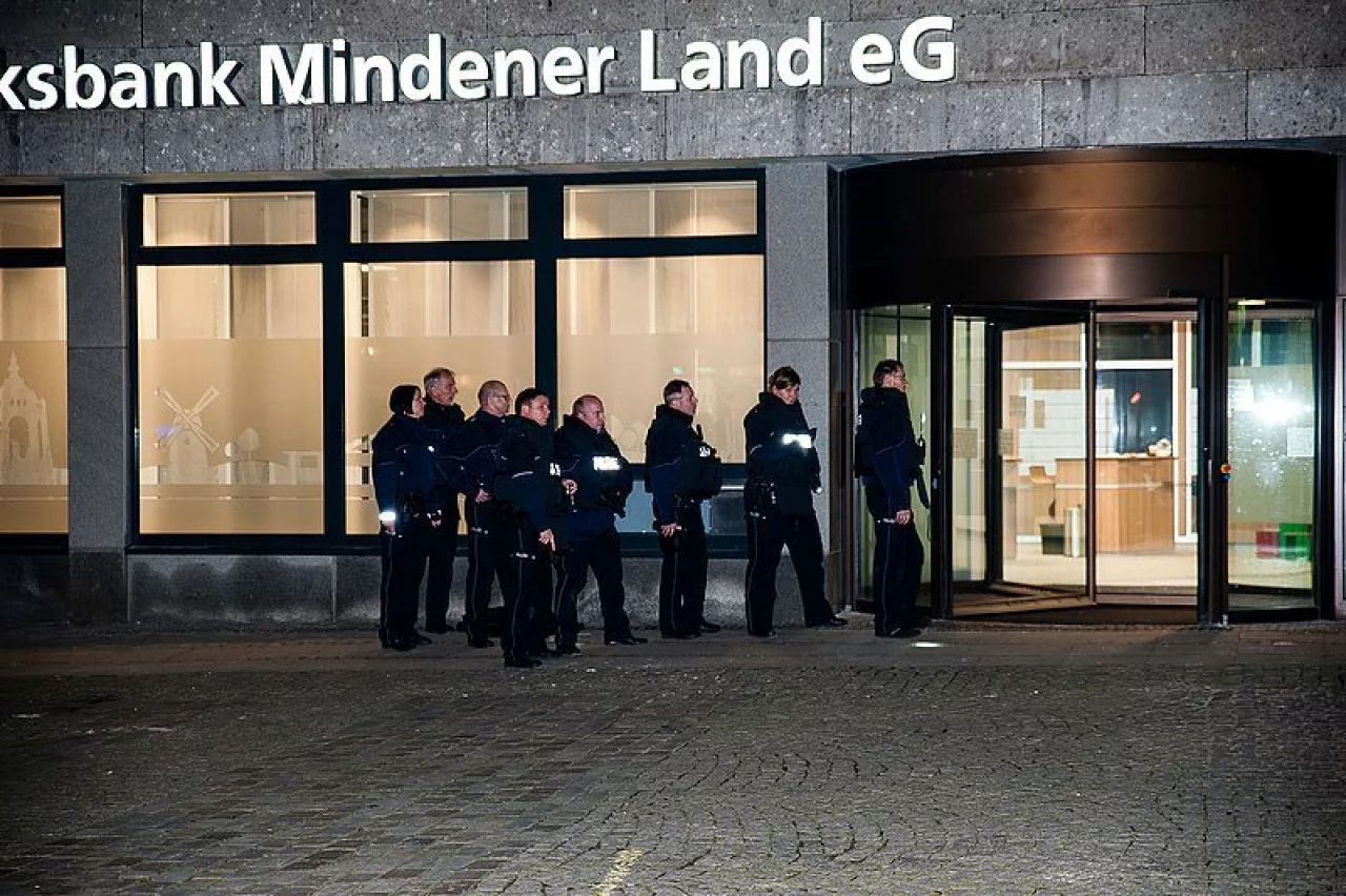 Nachdem alle unbeteiligten Personen in Sicherheit waren, umstellten die Beamten das Gebäude. Da nicht sicher war, ob die Räuber bereits geflüchtet waren oder sich womöglich im Gebäude aufhielten, verstärkte die Polizei ihre Absperrung. Zur Unterstützung wurden auch Einsatzkräfte aus den Kreisen Lippe und Herford angefordert. Die anschließende Durchsuchung des Hauses brachte keine konkreten Hinweise auf den Verbleib der Täter. Ein Hubschrauber mit einer Wärmebildkamera sicherte die Einsatzkräfte aus der Luft ab. Annähernd 50 Beamte, darunter auch ein Spürhund, waren im Einsatz.