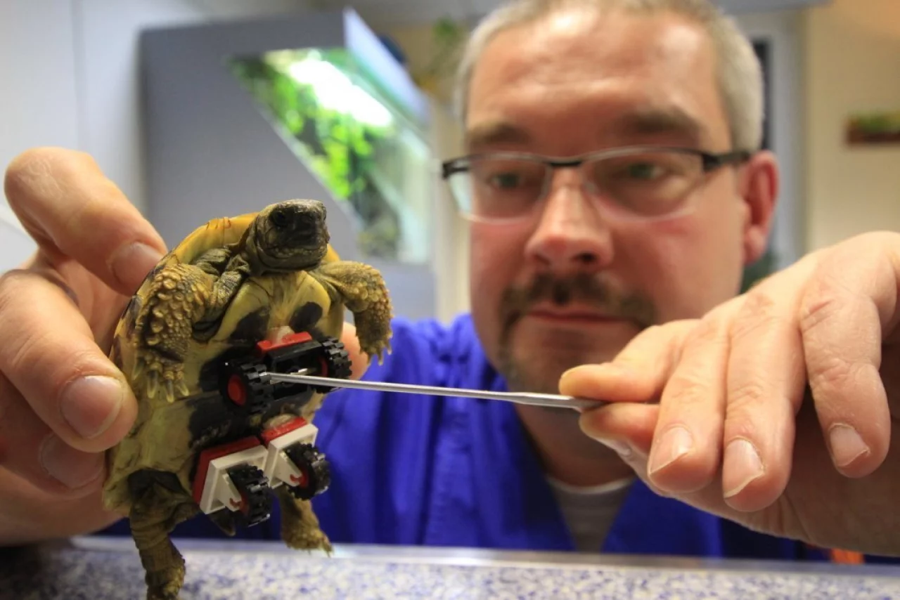 Der Veterinärmediziner hat eine clevere Idee. Er leiht sich Legosteine und die dazu passenden Räder von seinem Sohn und klebt sie der Schildkröte mit einem hautverträglichen Mittel unter den Panzer. Die Behandlung schlägt an. Schon bald kann sich die Schildkröte auf den Rädern fortbewegen. Heute, nur acht Wochen später, kann sie wieder ohne die rollende Gehhilfe leben.