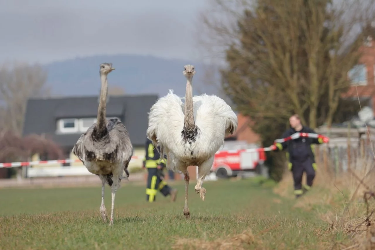 Porta Westfalica. Drei aus einem Gehege in Porta Westfalica-Eisbergen entwichene Nandus haben am Dienstag deren Besitzer, das Ordnungsamt, die Feuerwehr und die Polizei auf Trab gehalten. Nach mehr als dreieinhalb Stunden befanden sich schließlich die Henne und das Jungtier wieder in dem umzäunten Gelände. Der 5 Jahre alte Hahn überlebte die Aktion nicht.