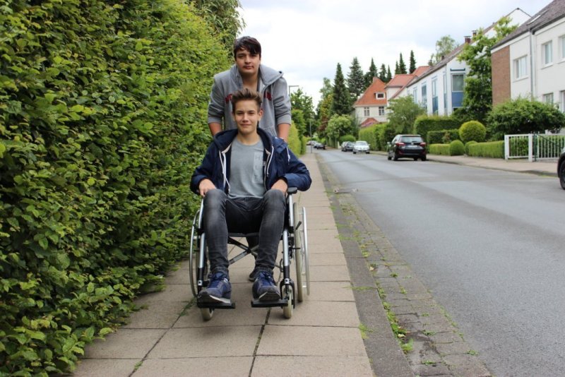 Marius, der bei diesem Versuch die Rolle des Menschen mit Behinderung einnahm, Frederik und Constantin machten sich an einem Vormittag mit einem ausgeliehenen Rollstuhl von ihrer Schule auf den Weg ins Stadtzentrum. Ihre Ziele waren ein Drogeriemarkt, die H&M-Filiale und die Sparkasse in der Innenstadt.
