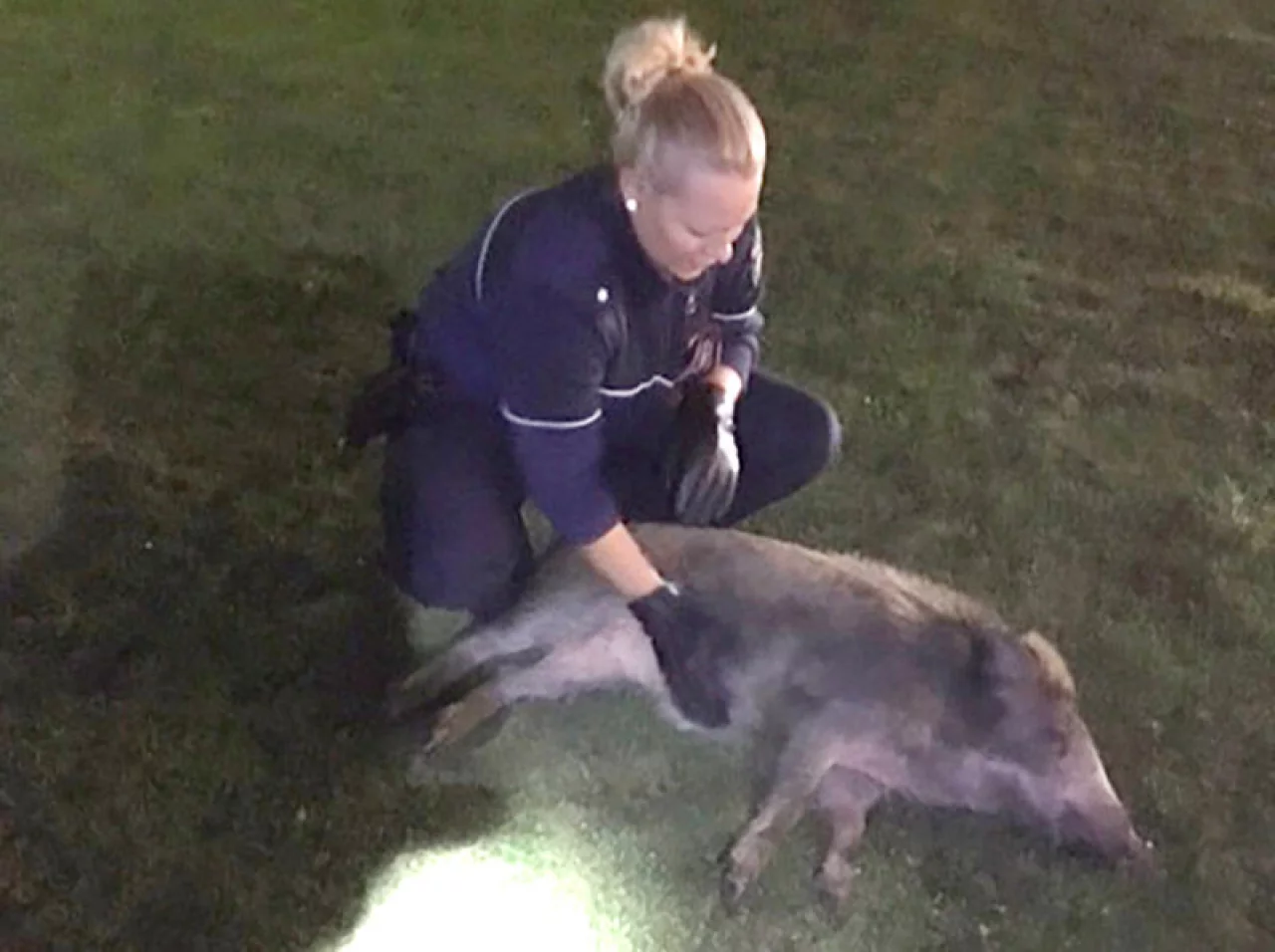Soest. Ein Polizistin krault ein junges Wildschwein. Dieses Foto eines Einsatzes vor einem Burger-Restaurant in Soest sorgte für Aufmerksamkeit. Die Polizei brachte das handzahme Wildschwein in ein Tierheim. Mittlerweile hat der Besitzer sein Tier wieder abgeholt.
