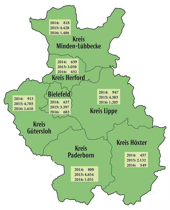 Bielefeld. Das Flüchtlingsaufkommen in OWL ist 2016 deutlich zurückgegangen. 7.171 Flüchtlinge sind den 70 Kommunen zugewiesen worden, was ungefähr dem Niveau von 2014 mit 5.211 Zuwanderern entspricht.
