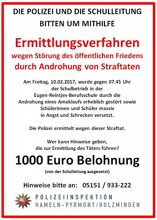 In Abstimmung mit der Schulleitung fahndet die Polizei Hameln mit Hilfe eines Plakates im Schulgebäude weiter nach dem Täter. Die Schulleitung der Eugen-Reintjes-Schule hat zudem eine Belohnung von 1.000 Euro für Hinweise ausgesetzt, die zur Ermittlung des Täters führen.