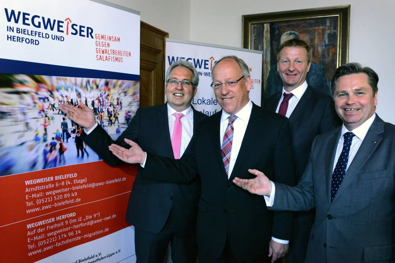 Um ein interkommunales Präventionsnetzwerk in OWL aufzubauen, hat die Trägergemeinschaft der „Wegweiser"-Beratungsstellen in Herford und Bielefeld, bestehend aus dem AWO-Kreisverband Bielefeld und dem AWO-Bezirksverband OWL, zwei Frauen und einen Mann eingestellt, die Beratungen auf deutsch, türkisch, arabisch, englisch und französisch anbieten. Die neuen Mitarbeiter sind seit April im Einsatz und nach Angaben von Iris Wolter und Kirsten Hopster von der AWO in den Disziplinen Psychologie, Soziologie und Islamwissenschaften beheimatet, allerdings nicht in der Extremismusprävention.