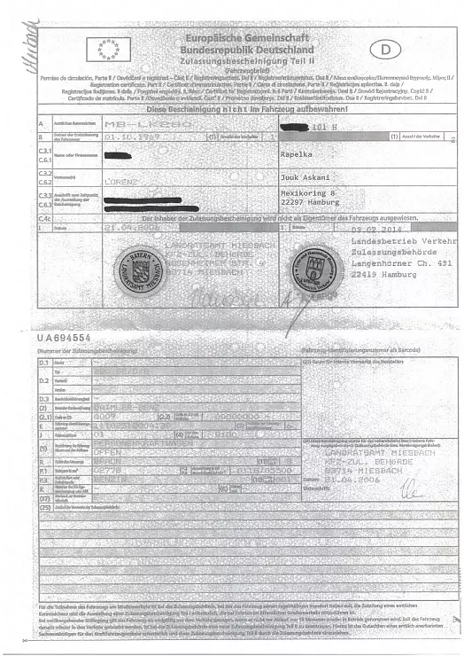 Der Verkäufer schickt auch persönliche Bilder und eine Kopie seines Personalausweises. Einen eingescannten Fahrzeugschein sendet er ebenfalls, aber die entscheidenden Daten sind auf dem digitalen Foto auch in der Vergrößerung nicht erkennbar.