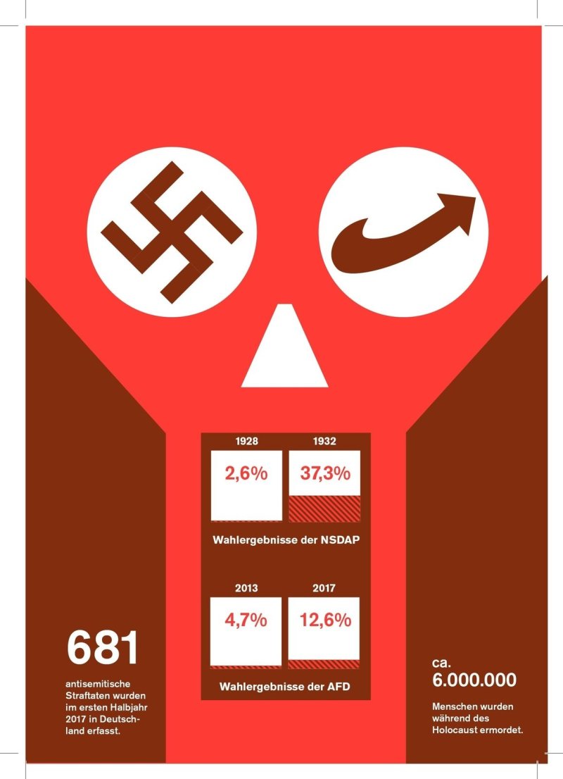 Die Illustration stellt die gestiegenen Wahlergebnisse der Nazipartei NSDAP aus den Jahren 1928 und 1932 sowie der AfD von 2013 und 2017 untereinander. Ergänzt wird das Bild durch die Zahl von sechs Millionen Menschen, die während des Holocausts ermordet wurden, und die Zahl der 681 antisemitischen Straftaten, die im ersten Halbjahr 2017 erfasst wurden.